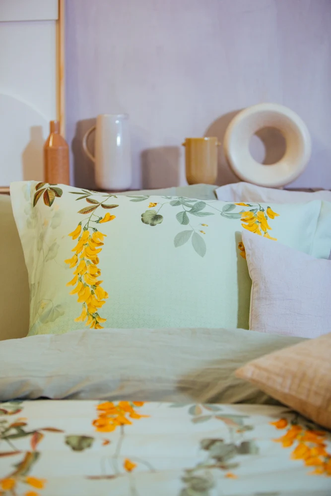 Victoria dekbedovertrek heeft aan de bovenkant verschillende takken met bloemen die naar beneden lijken te hangen op een achtergrond die van een donkere naar een lichtere tint vervaagt met vierkantjes met donkere lijnen die alle kanten uit staan voor een speels effect. De achterkant van het dekbedovertrek is effen. De kussens hebben hebben aan beide zijden enkele takken en bloemen die naar beneden hangen waarbij de achtergrond ook kleurverkoop heeft en het patroon met vierkantjes. Door de digitale druk, komt de levensechte print helemaal tot leven. De takken en bloemen van Victoria dekbedovertrek van Vandyck laten je wegdromen over een landgoed op een zonnige plek met begroeiing die een romantische uitstraling geven. Een perfecte vibe voor een heerlijk ontbijt en om ontspannen de dag te beginnen.